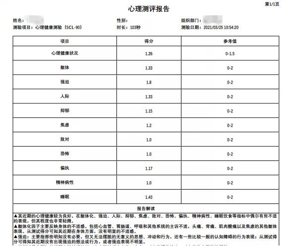 每份心理測(cè)評(píng)報(bào)告都具有該測(cè)評(píng)對(duì)象的姓名、所屬團(tuán)體、測(cè)驗(yàn)項(xiàng)目、測(cè)驗(yàn)時(shí)間、測(cè)評(píng)指標(biāo)得分以及對(duì)應(yīng)的報(bào)告解讀。