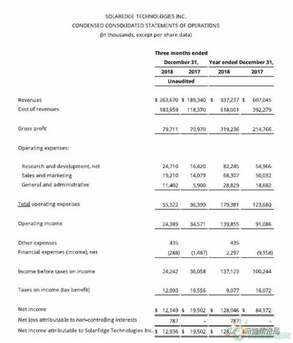 根據SolarEdge發布的消息,2018年全年營收9.372億美元,公認會計準則毛利率為34.1%,基于公認會計準則凈攤薄每股收益2.69美元。