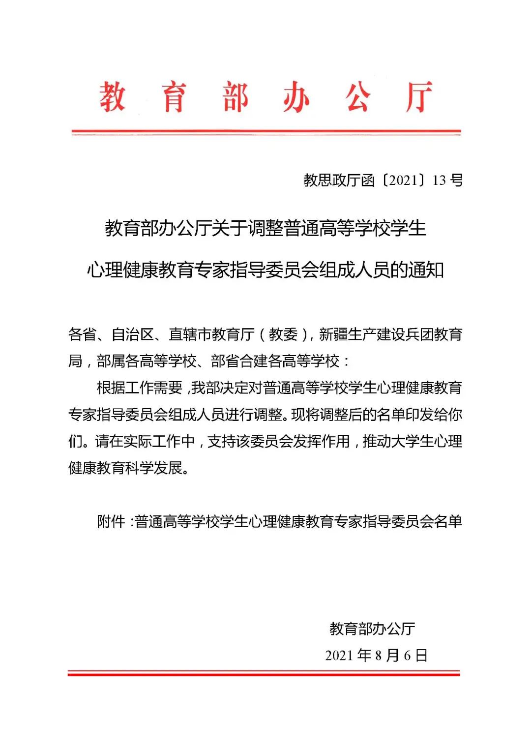 教育部辦公廳關(guān)于調(diào)整普通高等學(xué)校學(xué)生心理健康教育專家指導(dǎo)委員會組成人員的通知