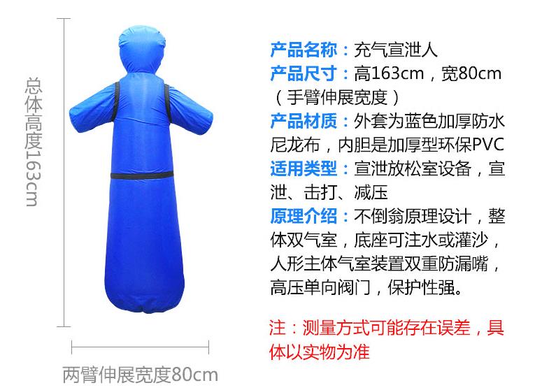 2、環(huán)保材質(zhì):充氣宣泄人內(nèi)膽為0.5mm加厚型環(huán)保PVC,外為藍(lán)色加厚防水尼龍布